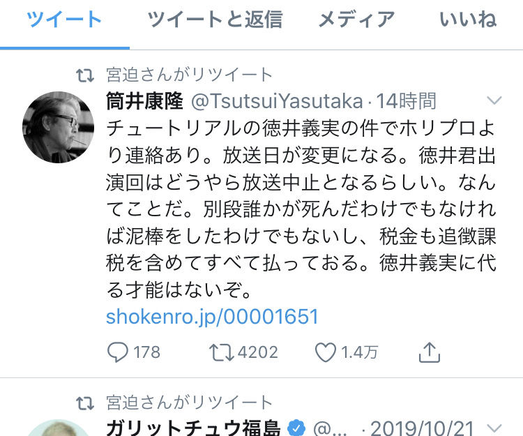 筒井氏は30日に自身のツイッターで、チュートリアル・徳井義実との共演番組の放送日が変更になったと連絡があったことをあかし「徳井君出演回はどうやら放送中止となるらしい。